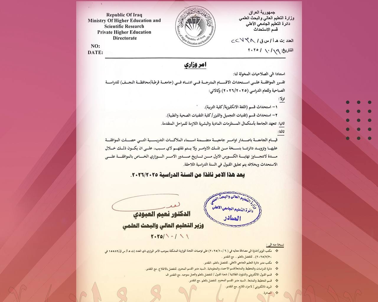 تعلن رئاسة جامعة قرطبة الأهلية عن حصول موافقة معالي وزير التعليم العالي والبحث العلمي الأستاذ الدكتور نعيم العبودي على استحداث الدراسة الصباحية في التخصصات التالية للعام الدراسي (2025_2026)