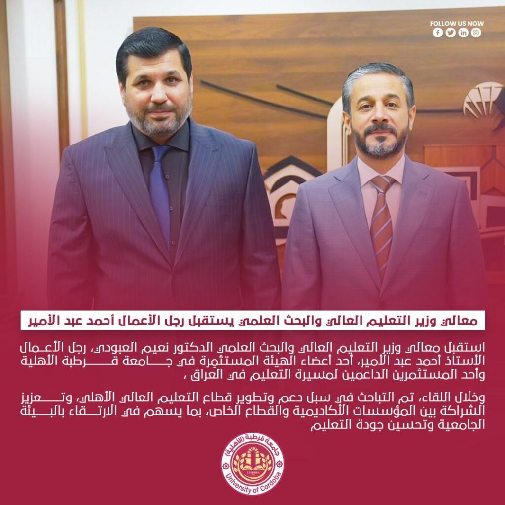 🏛️ معالي وزير التعليم العالي والبحث العلمي يستقبل رجل الأعمال أحمد عبد الأمير
