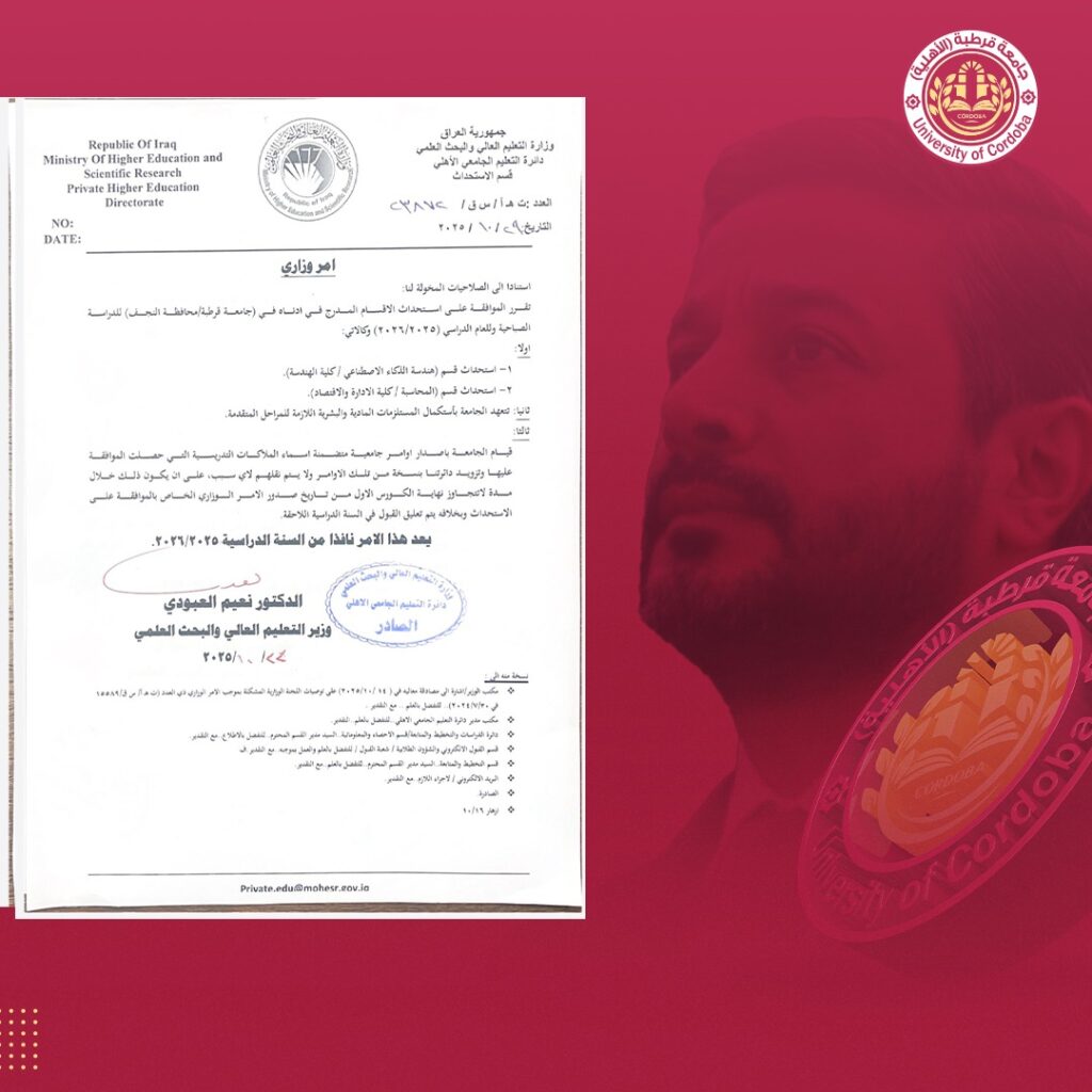 حصلت موافقة معالي وزير التعليم العالي والبحث العلمي الدكتور نعيم العبودي على استحداث مجموعة من الأقسام العلمية الجديدة في جامعة قرطبة الأهلية